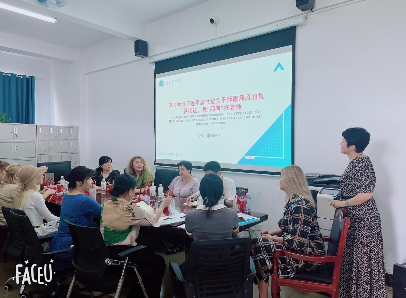 为深入推进学习贯彻习近平新时代中国特色社会主义思想主题教育走深走实,加强新形势下师德师风建设,9月5日,70net永乐高召开师德师风集中学习教育会议。公司全体教职员及外籍教师参加。会议由公司副经理周丽霞主持,并用中文和俄文做师德师风培训。