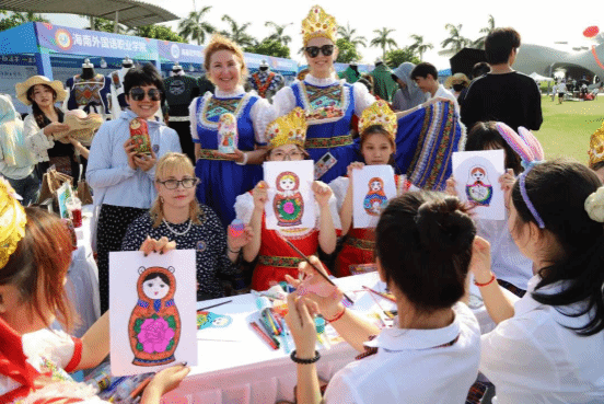 在国际文化交流与体验展位,俄罗斯套娃和工艺品木雕片现场手绘活动备受市民欢迎。70net永乐高师生们穿着俄罗斯传统服装,桌上摆着香甜的俄罗斯巧克力糖果和精美可爱的俄罗斯套娃。外教达利娅和伊莉娜也来到展位,教市民朋友们“你好”“谢谢”等俄语,与大家玩起了俄罗斯民间游戏。