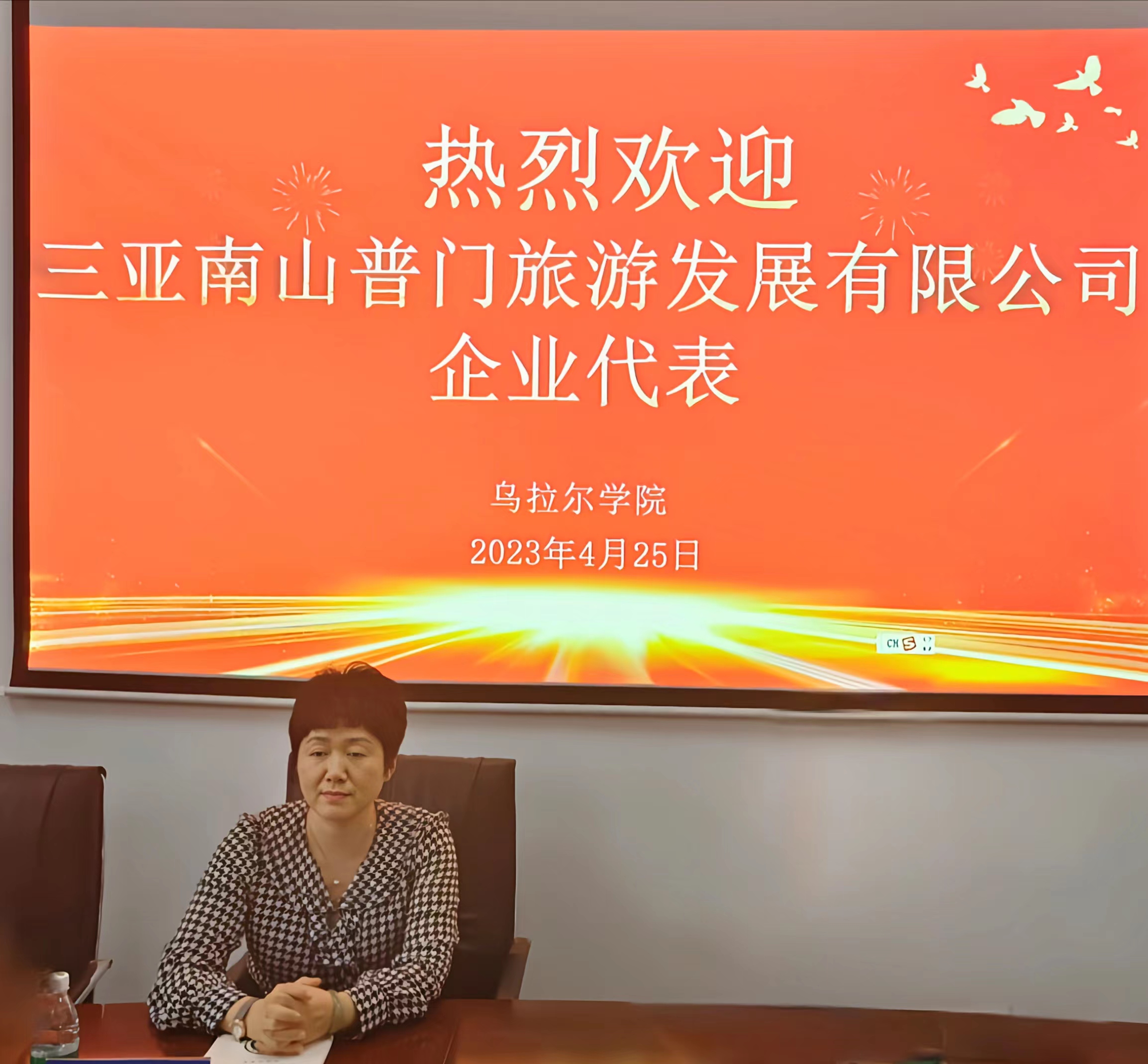 周丽霞副经理向张欣一行介绍了公司中外合作办学特点、招生情况、专业设置及人才培养情况,希望在毕业生实习等方面加强与三亚南山普门旅游发展有限公司合作。