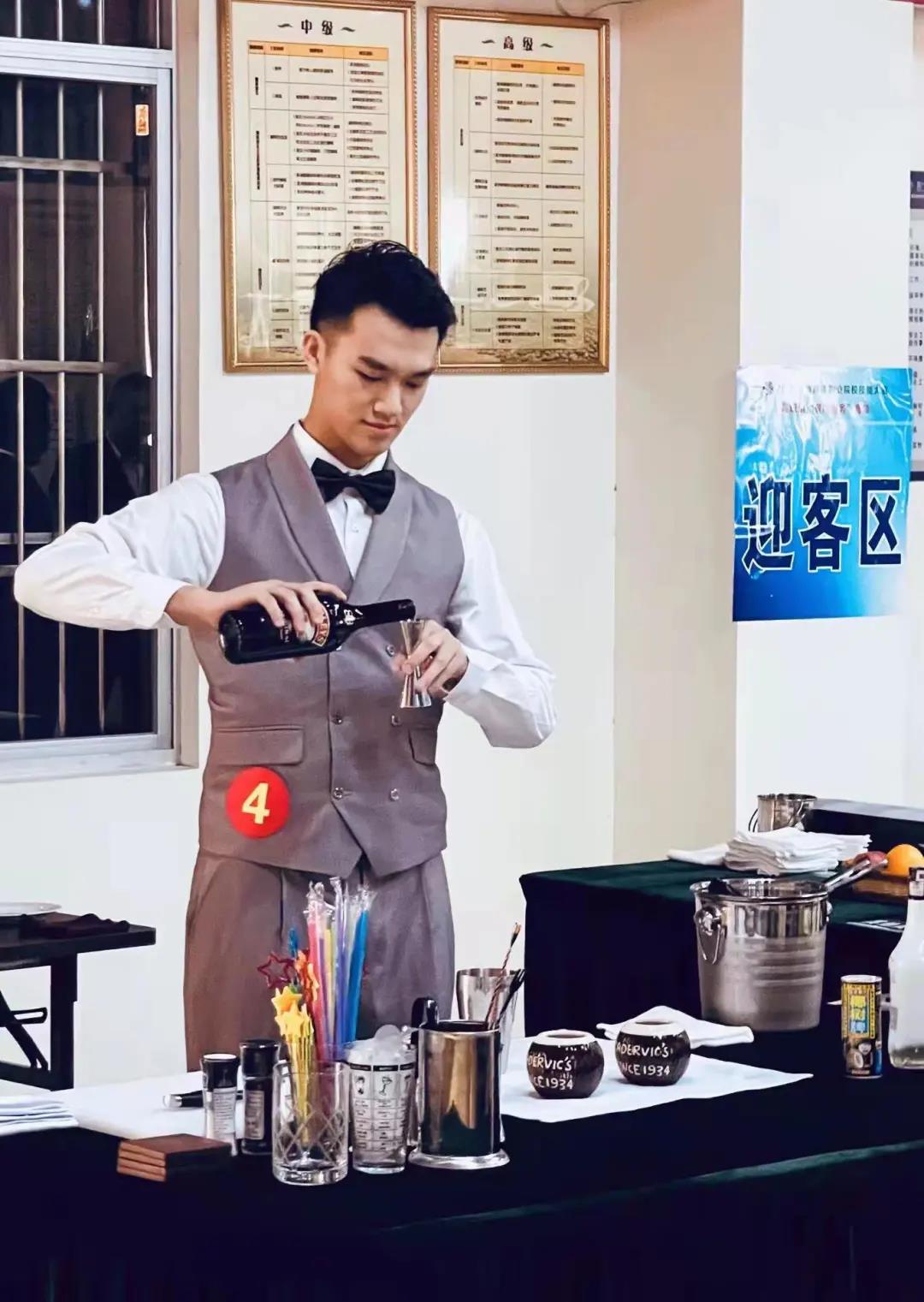 20级旅游管理班王洪亮在西餐摆台与鸡尾酒调制赛项当中鹳荣获银奖。