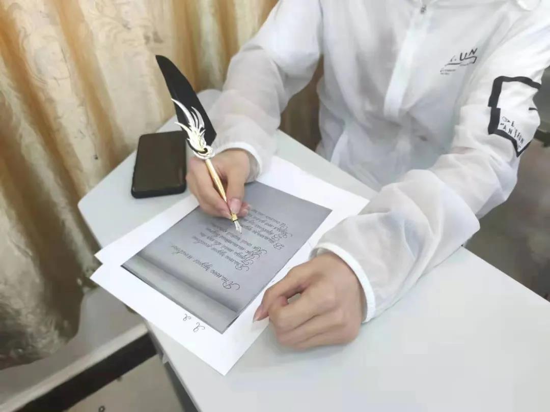 比赛流程主要有:公布比赛规则及比赛诗目、正式书写、评委评分、颁发奖品。在比赛环节,各参赛同学专注认真、全神贯注,不仅展示了书写的良好姿态,更完美体现了海经贸员工优秀的精神风貌。比赛时员工使用经典羽毛笔,将俄式书写习惯融入写作过程。他们洋洋洒洒、奋笔疾书,用清秀的字迹赢得了俄语教研室教师的一致赞赏,同时也将“书我之感,写其精神”的书法精神根植在心中。