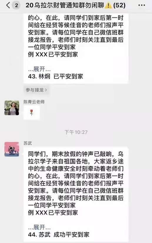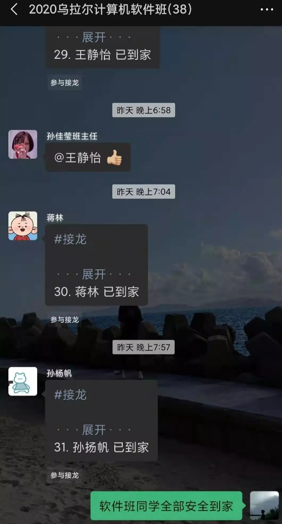 为了确保每一位同学的安全,同学们到家后要及时在群里接龙报平安,以免老师牵挂,这也是自己责任心的体现。