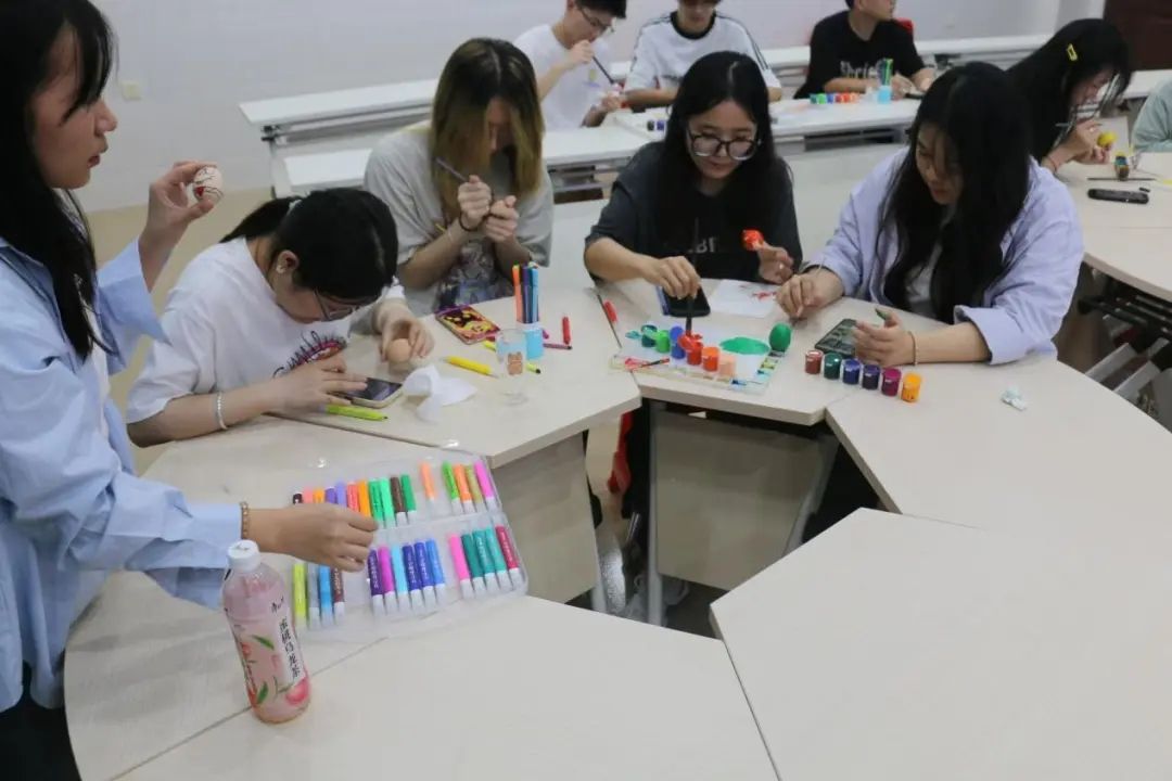 活动伊始,陈青云老师与同学们相互认识,随后发放鸡蛋、颜料和绘画工具,鼓励大家发挥想象,释放心灵,自由创作。听完团辅老师的讲解后,同学们拿起鸡蛋放在掌心,构思设计,想象色彩的碰撞与融合,脸上带着轻松与平静,似乎在与内心交谈,接着开始创作,同学们把自己的奇思妙想描绘在鸡蛋上,一个普通的鸡蛋五颜六色、异彩纷呈的“杰作”就此诞生。
