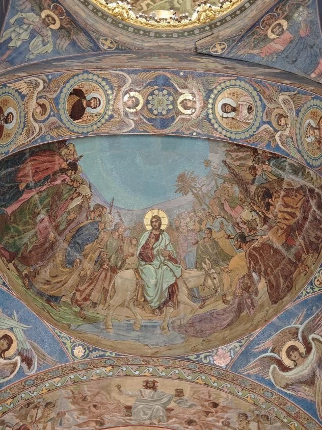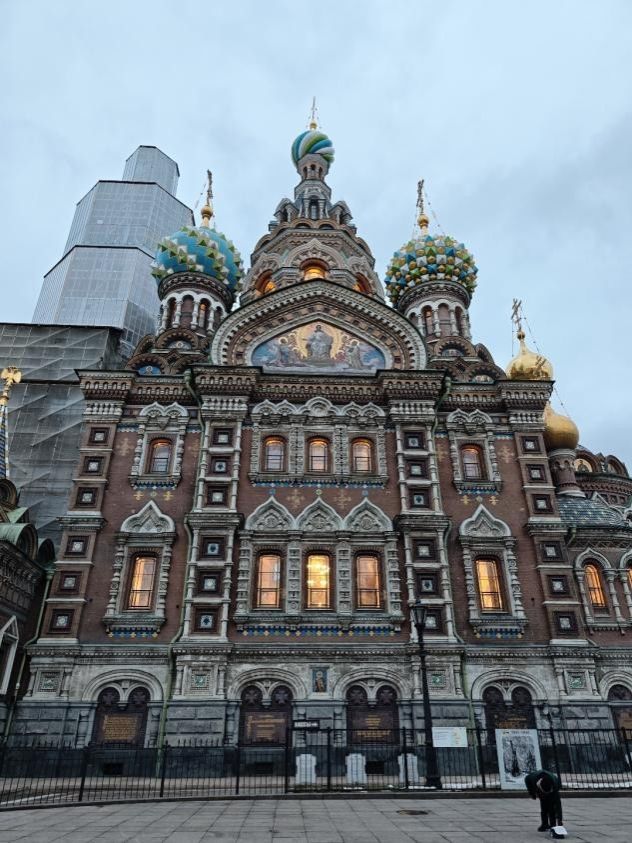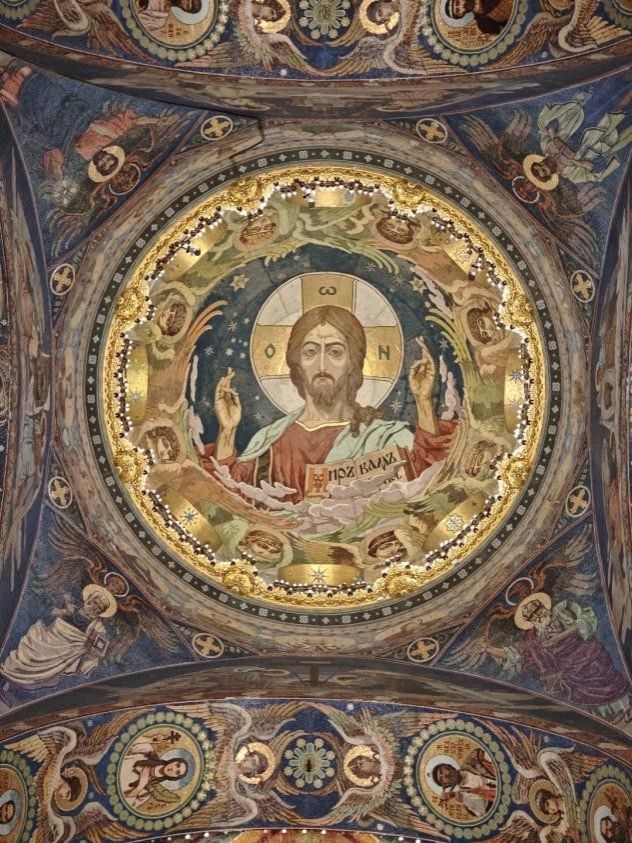 圣彼得堡的滴血大教堂则是华丽的梦:砖红墙攀着蓝绿金的洋葱顶,像童话里偷跑出来的城堡。仰头望穹顶,圣像画的金箔在暗处发光,耶稣的手势破开蓝青的漩涡,像是要把千年虔诚灌进我呼吸里。