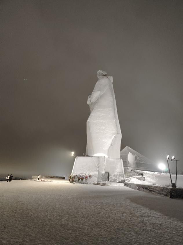 假期把我抛向更远处:摩尔曼斯克的港口在夜里亮成金箔海,坐标牌上“68°58′22.3″N”像枚北极圈的印章,盖在我发烫的眼睑上。晚上看见英雄纪念碑,他那巨大的白色雕像吞掉星光,碑下花圈凝着霜,默默守护着这座美丽的城市。
