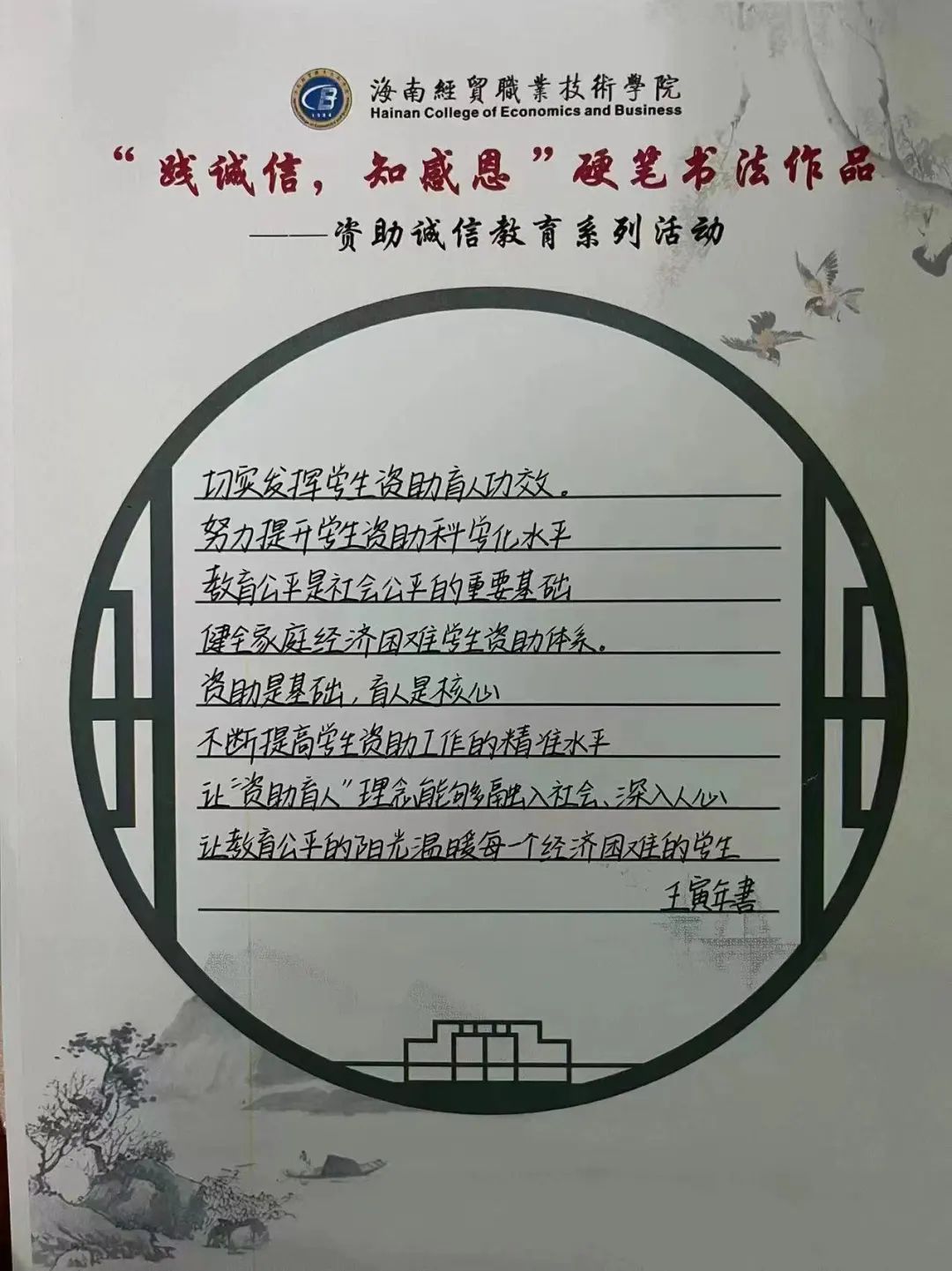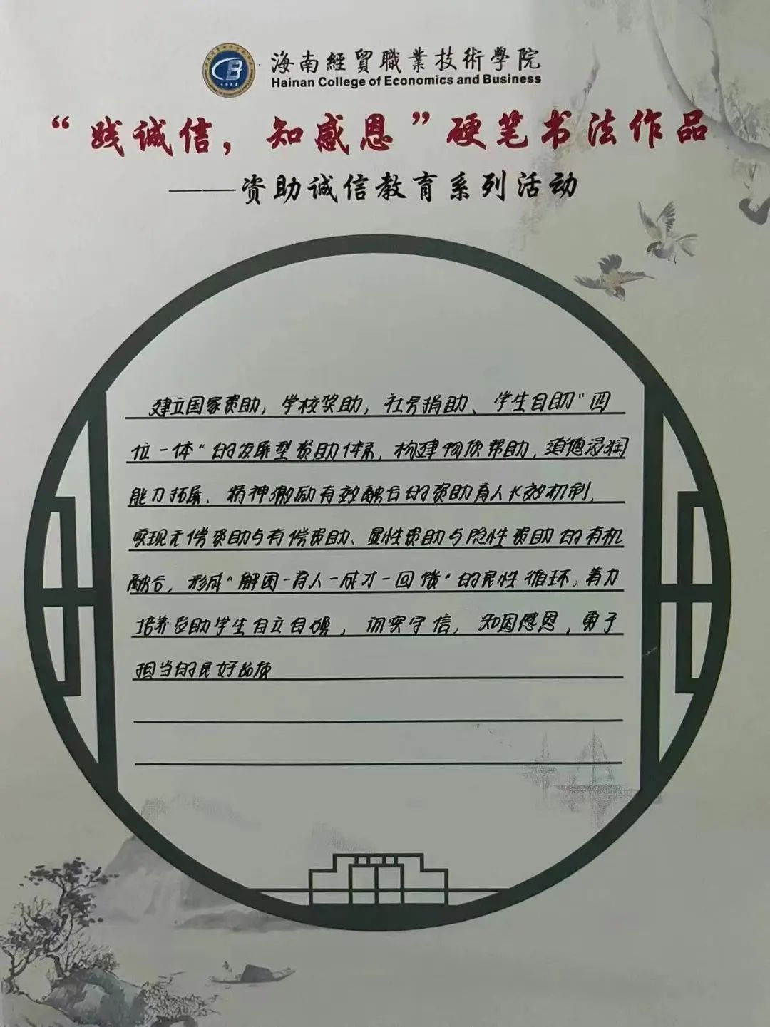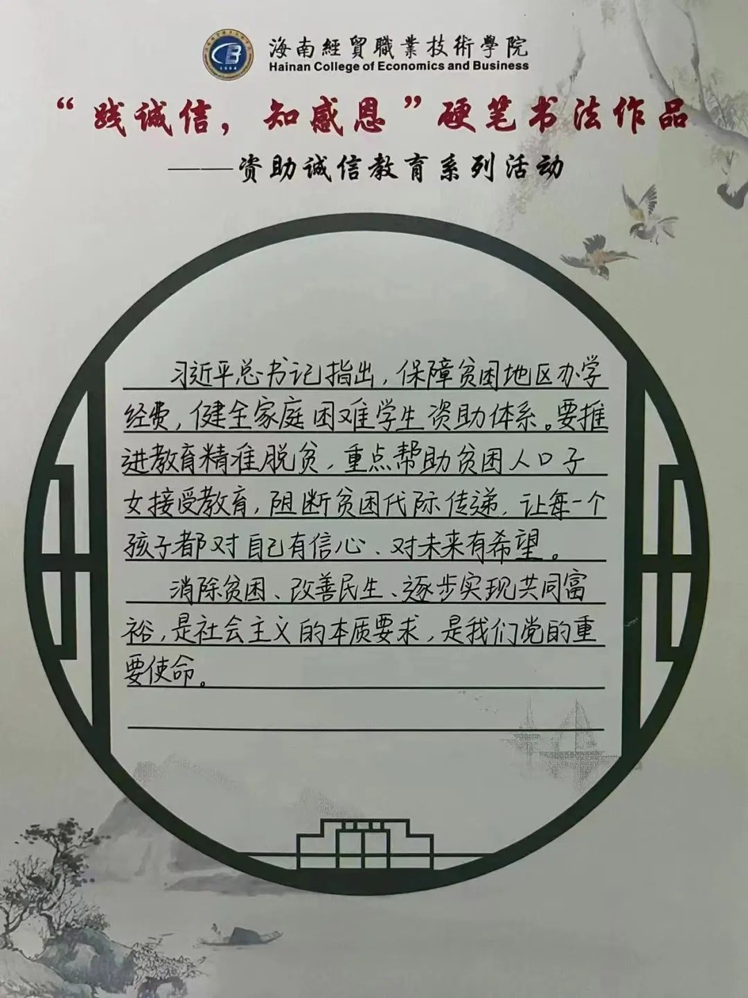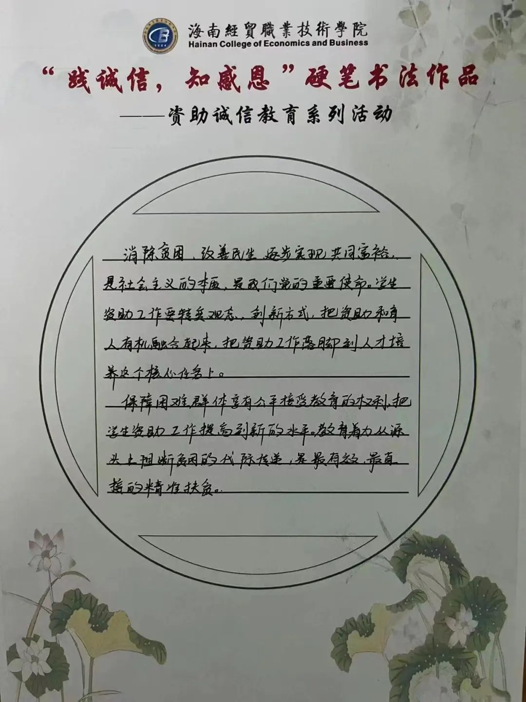为进一步推动员工资助文化建设,激励广大受助员工奋发自强、立志成才、感恩回馈,公司开展“践诚信,知感恩”员工硬笔书法作品征集评选活动。公司共评选出四个优秀作品,让我们一起来看看吧!